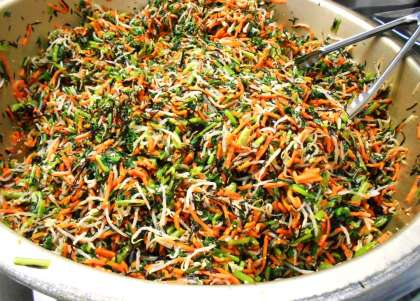 今日の給食は、<チャーハン>です。焼き豚、いり卵の他に4種類の野菜を入れました。給食では、ごはんを炊く時に油を加えて、ごはんがぱらぱらになる工夫をしています。