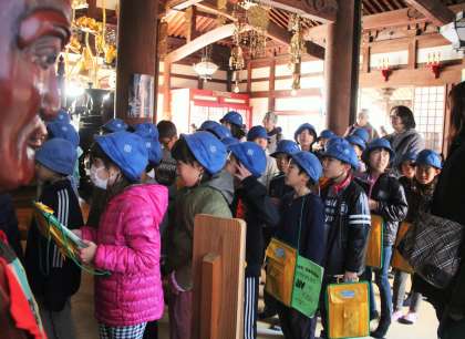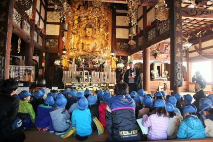 紅葉が美しい九品仏浄真寺に到着です。閻魔様についての話や九体の仏様の意味、九品仏に古くから伝わる伝統行事の「おめんかぶり」の話などを、お寺のお坊様に伺いました。普段は入ることのできない所まで入れていただき、興味深いお話を、メモをとりながら真剣に聞くことができました。