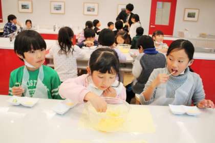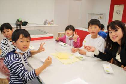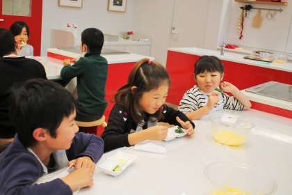 キュウリに、作ったマヨネーズをつけて食べました。おいしさの秘密、ものづくりへの想いと工夫などを学びました。