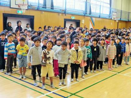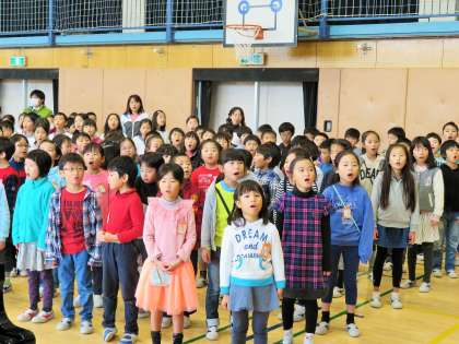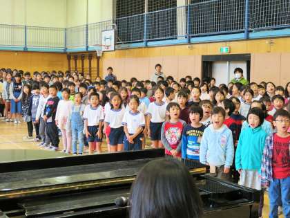 今日の音楽朝会は「夕焼け小焼け」を歌いました。まずは、授業で学習している2年生の子どもたちによる、美しい歌声を聞いてから、その歌声をお手本として歌いました。
