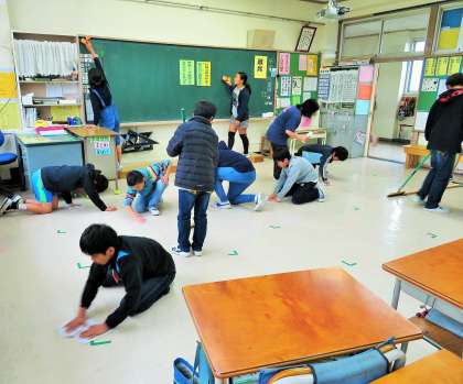 4年生は机に顔を伏せ、目を閉じて集中をしてからスタートをしています。上級生になればなるほど、一生懸命に床を掃いたり磨く子どもたちです!