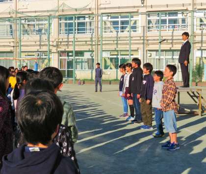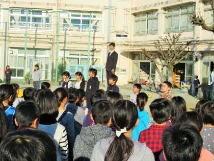 今日の全校朝会から、6年生の5〜6人が全校児童の前であいさつをすることになりました。卒業を前に6年生としての自覚をもたせるとともに、全校児童の前に立つ緊張感と、当日までに友達と協力する力を育てることをねらいとしています。