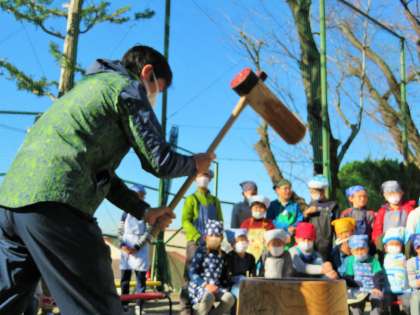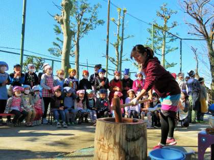 担任の先生や、園長の私も一緒にもちつきです。