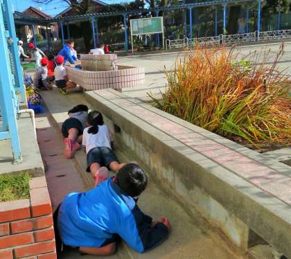 写真のように、4年1組体育授業を受けもつ新しい講師の先生も、さっそく子どもたちと一緒に給食を食べたり遊んだりしています。缶けりでは、校長室前のこんなところに隠れている子どももいます!