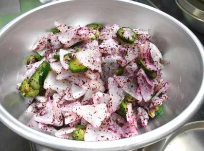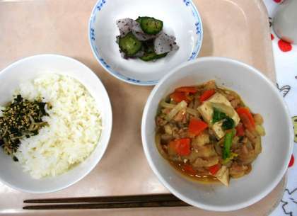 今日の主菜は、<すきやき煮>です。すきやき煮は、すきやきを給食風にアレンジした煮物です。展示食をみて、「すきやきだ。うれしいな。」と話している子もいました。今日は、豆腐は野菜や肉とは別に味付けをして作りました。甘辛の味付けは好きな子が多いようで、どの学級もよく食べていました。