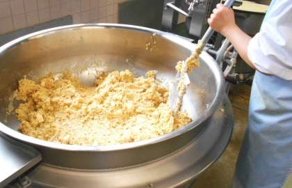 今日の主菜は、<ポテトコロッケ>です。じゃがいもを蒸してつぶし、炒めたひき肉と玉ねぎとあわせて、ひとつひとつ丸めて形を作り、パン粉をつけて油で揚げます。