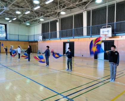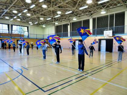 体育館でも張りつめた空気の中、フラッグとメジャーの練習に集中して取り組んでいます。保護者の皆様方には、朝練習へのご理解とご協力に感謝申し上げます。