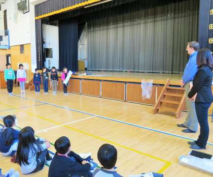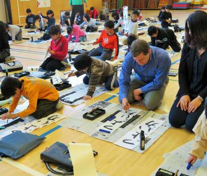 今日は3年生が、3年生から始めた毛筆での書き初め会です。今年度、砧小学校は東京都教育委員会から「日本の伝統・文化推進指定校」を受けています。日本の伝統・文化の良さを発信していく取り組みの一環として、都立総合工科高校のアダム先生とともに「書き初め会」を実施しました。