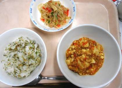 今日の給食の主菜は、<マーボー豆腐>です。マーボー豆腐は、中国・四川の料理です。四川料理は辛いのが特徴です。砧小では、マーボー豆腐のような辛い料理は辛さを2〜3段階に分けて、作っています。今日は、2段階の辛さにし、1〜3年生と4〜6年生に分けました。