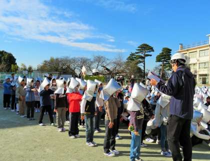 世田谷区災害対策課の方が訓練の様子を見ていて「校長先生は厳しいですね。お子さんたちは、全くお喋りがなく静かで真剣に取り組んでいますね」と褒めていただきました。