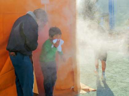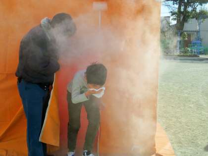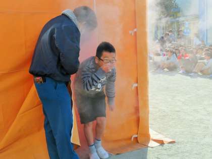 各クラスの代表児童と5年生は煙体験を行いました。煙の中はまわりが全く見えません。手探りで姿勢を低くして、歩きながら出口までなんとか歩いていました。