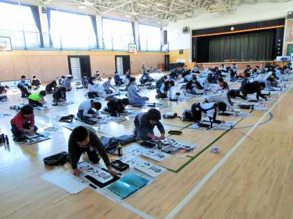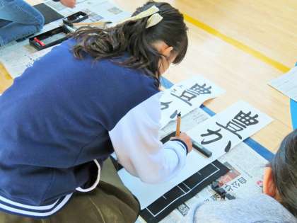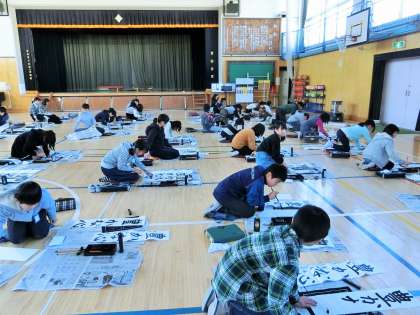 5年生の書き初め会の様子です。「豊かな心」というお題でしたが、お手本を見ながらみんな一生懸命です。私語のない静寂な雰囲気の中、体育館には墨の香りがいっぱい漂っていました。