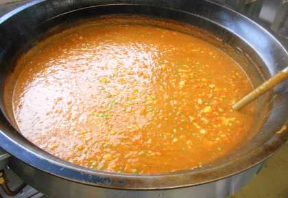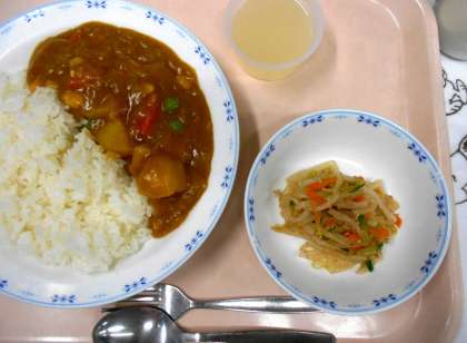 今日は給食の中でも、人気のある<チキンカレーライス>にゆでた大豆を加え、栄養を強化しました。砧小のカレーは、ルウから手作りしています。ルウは、小麦粉とバター・油で作りますが、調理員が長い時間焦がさないよう、心をこめて丁寧に炒めています。