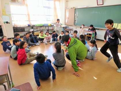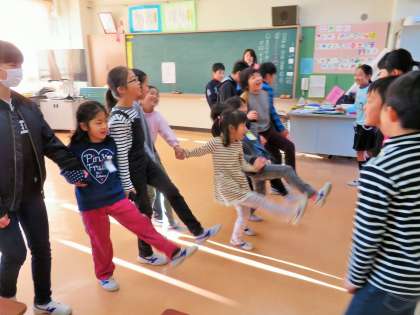 今朝の朝遊びは、縦割りの班で、6年生65人がすべて班長となる『新なかよし班活動』です。校庭は使えないため教室で遊びました。「ハンカチ落とし」や「はないちもんめ」で遊んでいる様子です。