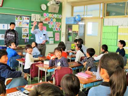 今日の3・4年生の英語活動は、カナダ出身のジェフ先生と担任の先生との授業です。