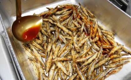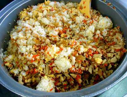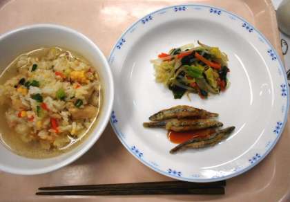 <奄美の鶏飯>は、鹿児島県奄美大島の郷土料理です。江戸時代に、薩摩藩の役人をおもてなしするために作られた料理と言われています。給食では、鶏肉やつぼ漬け、にんじん、干し椎茸を煮たもの、いり卵を混ぜたご飯に、上から鶏がらスープをかけました。どの学級も、よく食べていました。