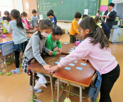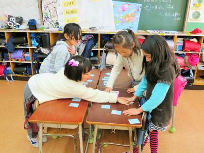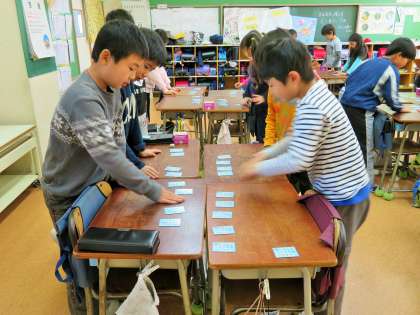 3年生が教科日本語の学習で、百人一首に取り組みました。机に並べた札を見つめる眼差しも真剣です。先生の読み上げる声が、いっそう高く響いていました!
