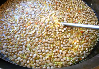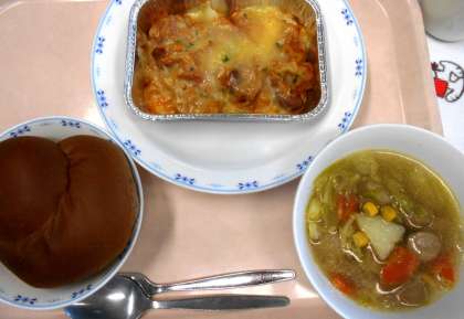 今日の主菜は、<豆のミートグラタン>です。ひよこ豆とうずら豆を使って、グラタンを作りました。豆類は食感が苦手な子も多いようですが、グラタンやシチューに入れると、食べやすくなるようです。どの学級も、よく食べていました。