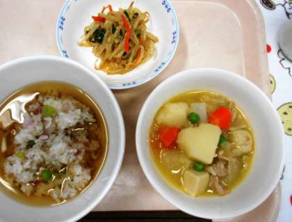 今日の副菜の<ごまあえ>に使っている小松菜は、世田谷区宇奈根の農家の海老澤さんが砧小の子どもたちのために育ててくれたものです。海老澤さんは、12月に3年生が畑見学でお世話になった方でもあります。大変ありがたく思います。