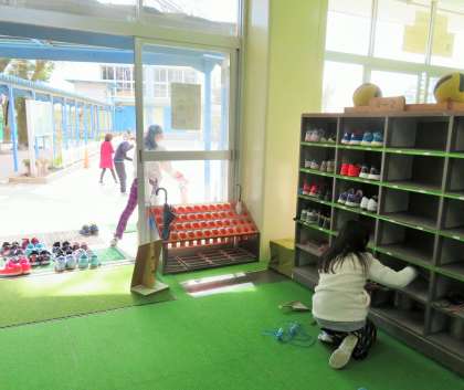 4年生の下駄箱掃除は、一人一人の靴を外ではたいて掃除をしています。