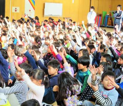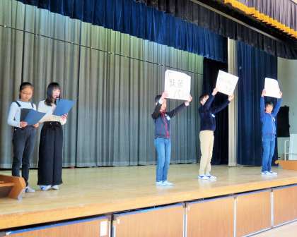 今日の児童集会は集会委員会による「6年生クイズ集会」です。6年生の思い出に残っている行事や好きな場所、好きな給食などについて3択でのクイズです。