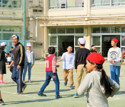 砧小学校の休み時間は、子どもと先生の「共遊び」の姿がたくさん見られます。子どもたちだけで遊ぶのも楽しいですが、先生と一緒に遊ぶのは、もっと楽しい・・・