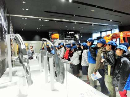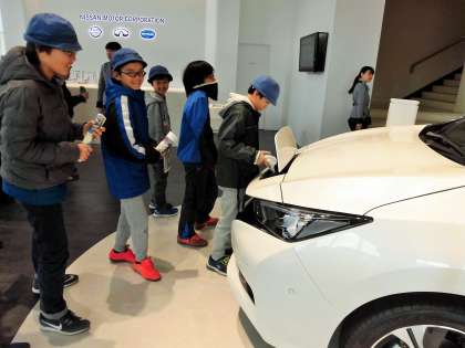 2017年4月より、リニューアルオープンした追浜工場ゲストホールです。ボディができるまでの展示品が並んでいました。実際に、電気自動車のコンセントをつないだり、ハンドルを握ったりしました。