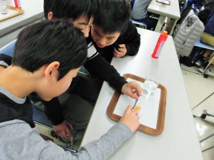 ラー油のついたスプーンを水に入れただけでは、スプーンについたラー油は落ちません。しかし、そのスプーンをビーカーに入れ洗剤を数滴たらすと、スプーンからラー油がはがれ、スーッと水面に浮いてきました。こすらなくても自然に浮いてくる様子を見て、子どもたちからは驚きの声や歓声が聞こえてきました。