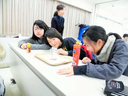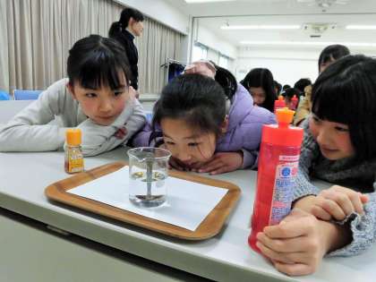 花王川崎工場では、食器用洗剤を使うと、なぜ脂汚れを落とすことができるのか、実験を通して学習しました。