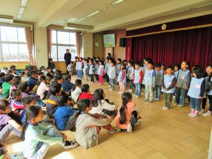 今日は、5年生と砧幼稚園の年長星組との交流会最終回です。幼稚園の遊戯室で、まずは、年長さんからのお礼の言葉と歌が披露されました。そして、5年生一人一人の首に、感謝の気持ちのこもったメダルがかけられました。