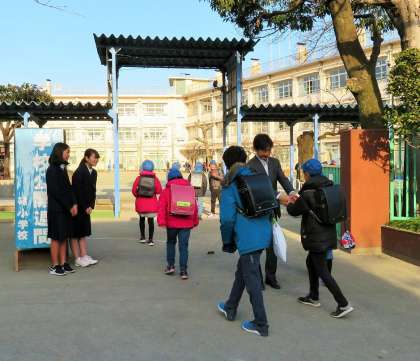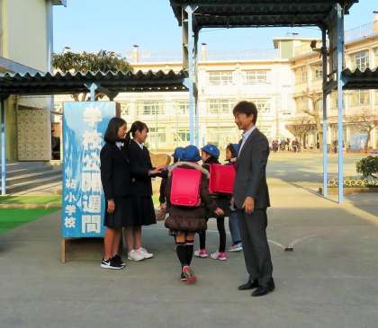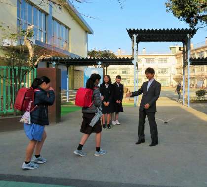 今日は「砧の学び舎」あいさつ運動です。本校の正門と幼稚園門には、砧中学校の生徒たち6名が、優しいまなざしで、私と一緒にあいさつをしてくれました。