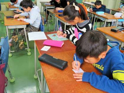 今日のなかよし班朝遊びの時間には6年生がいません。3月のお別れ給食・お別れセレモニーの準備なのです。これまで砧小学校をリードしてくれた6年生の班長さんに、一人一人が「ありがとう」の気持ちを込めてメッセージカードを書きました。