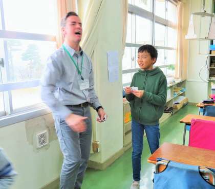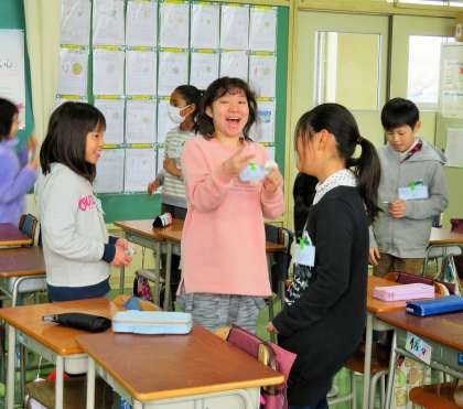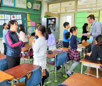 4年生の英語活動、最終回の様子です。今回のテーマは「スポーツ」です。スポーツの名前と、そのスポーツで使う用具について、ジェフ先生の発音を聞きながら何度も練習しました。そのあと、スポーツの絵が描いてあるカードを持ち、自分が持っているスポーツに必要な用具の絵とペアになるように、友達とジャンケンをしながら、「○○○,please」と、欲しいカードを集めるゲームをしました。どの子も自分から友達に英語で関わり、英語に親しむことができました。