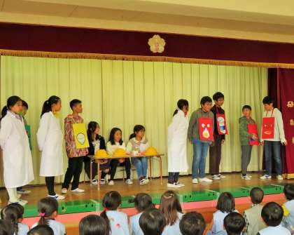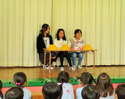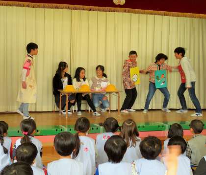 子どもたちが台本から考えたもので、園児が楽しめるように「お肉くん」、「ご飯くん」、「野菜くん」が登場したり、赤、黄色、緑の「博士」が出てきて、それぞれの食材やはたらきを教えたりしました。