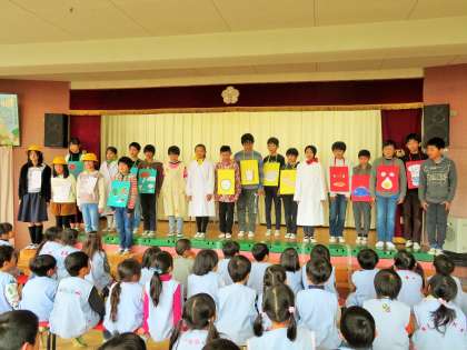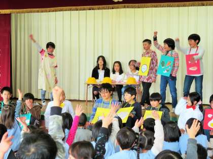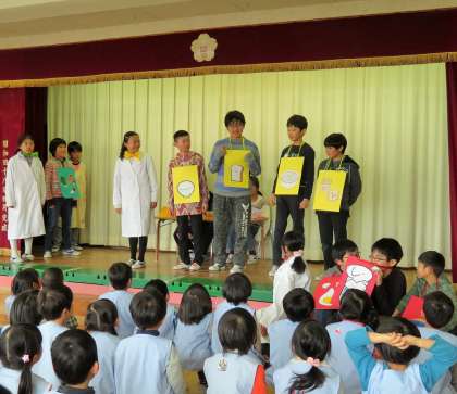 最後は、赤組、黄色組、緑組みんな力を合わせて、「好き嫌いなく食べよう!」と呼びかけました。幼稚園児たちはキャラクターが出てくるたびに、大喜びです。保健給食委員会の子どもたちもかわいい園児たちに手を振られ、大きな達成感を得ることができ、やりきったいい顔で学校に戻ってきました。よく頑張りました。