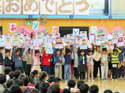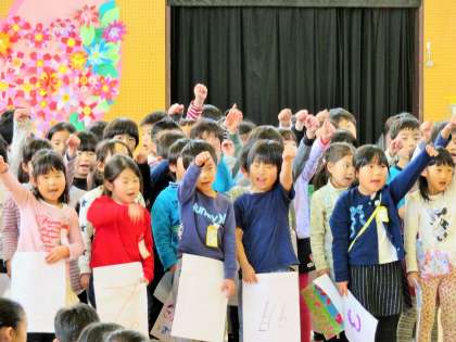 1年生は、お世話になった6年生への呼びかけと、「誰だってお誕生日」の歌を歌いました。6年生の顔をカードに描き、誕生日を覚えて、歌詞に合わせてカードを見せて、6年生の誕生月に「はーい!」と言ってもらえるように工夫しました。
