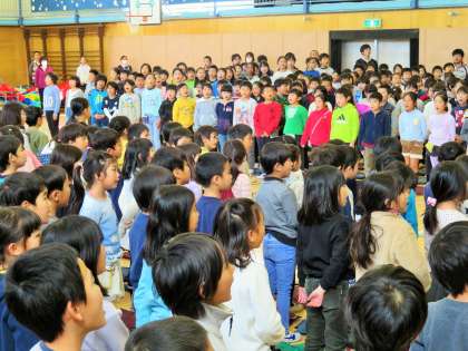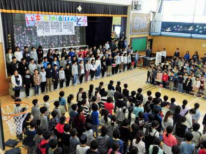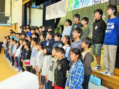 最後は全校合唱「さようなら」です。全校の子どもたちで歌えるのは、もう最後ですので特別な思いで歌いました。私の両側からは、すすり泣きが聞こえてきました。