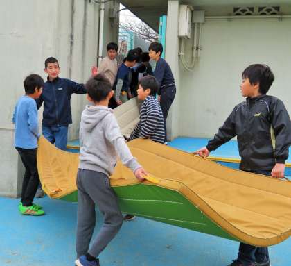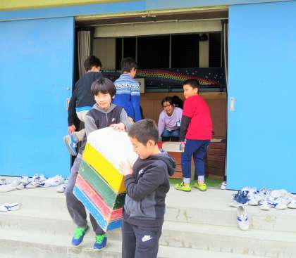 砧小学校の新リーダーである5年生が、卒業式に向けて、体育館に必要のない体育用具の片付けに取り組みました。学校行事を下支えする活動ですが、嫌な顔ひとつせず、率先して笑顔で取り組む姿が素敵です。