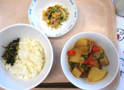 今日の主菜は、<肉じゃがのうま煮>です。肉じゃがは、じゃがいもをたくさん使ったほっとする料理ですね。子どもたちも、食べ慣れているようで、もりもり食べていました。どの学級も、ほとんど残食はありませんでした。