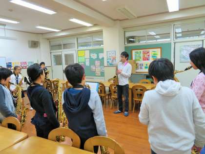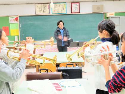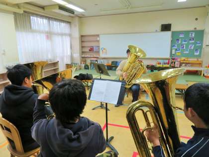 今日は5年生が、特別講師による鼓笛の講習を受けました。子どもたちは本物の音を聴きながら、音譜の読み方、音の出し方など、パート毎に講習を受けました。