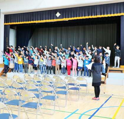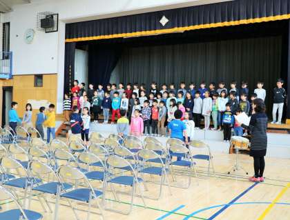 2年生は、この1年間で学んできた「こいぬのbingo」「ともだち」などの歌を歌います。6年生を送る会で行った「おちゃらかほい」「なべなべそこぬけ」を披露し、最後は、歌のメドレーです。