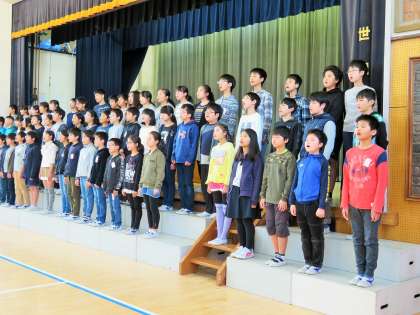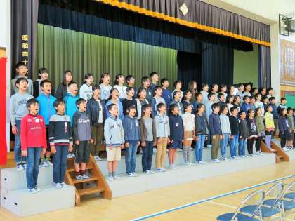 卒業式に向けて、4・5・6年生が合同で練習しました。礼法や呼びかけ、歌の確認など、ピーンとした緊張感が張り詰めた中、美しい声が響いています。