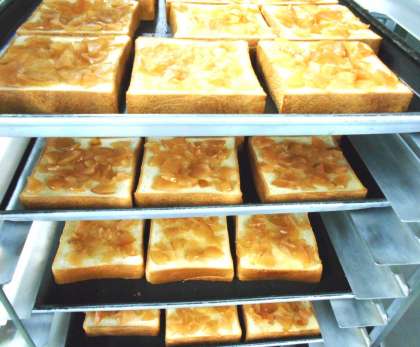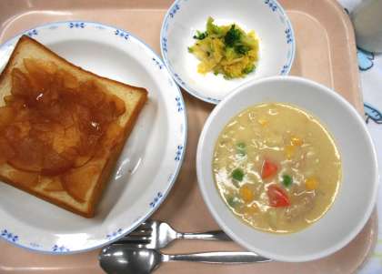 今日の主食は、6年生からのリクエストメニュー<アップルトースト>です。青森県産のりんごをうすく切り、はちみつや砂糖と一緒に煮たものを、バターを塗ったパンにのせて焼きます。しっとりした味わいのトーストに仕上がり、子どもたちはよく食べていました。