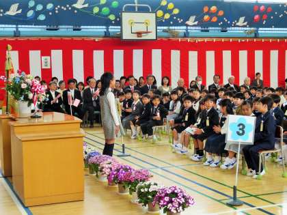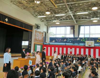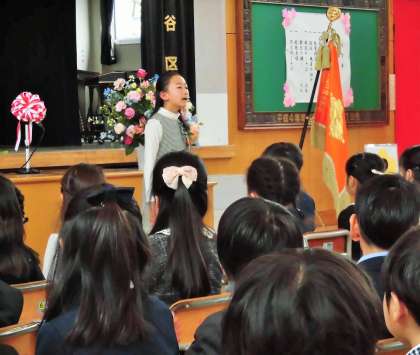 担任の先生の発表と、6年生代表児童による「歓迎の言葉」です。さすが砧小学校の6年生です。1年生が安心できる、心のこもった歓迎の言葉でした。