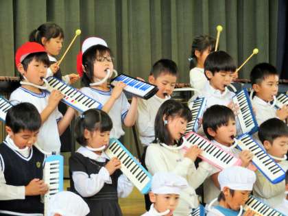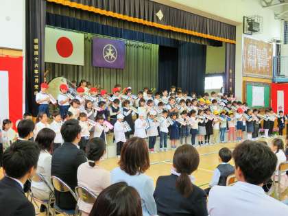 2年生による「歓迎の催し」です。心のこもった呼びかけや学校生活の様子、「こいぬのマーチ」の合奏をしている姿に、1年間の成長を感じました。