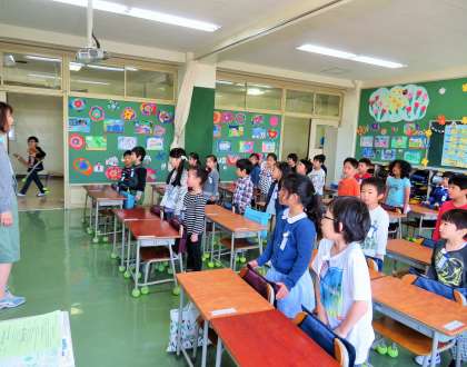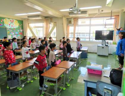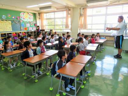 姿勢正しく先生の話を聞いている子どもたちに感激です。砧小学校の1年生は、みんな勉強が大好きな子どもたちに見えました。やる気いっぱいの子どもたちを見て嬉しくなりました!