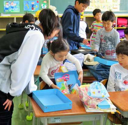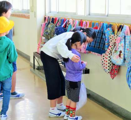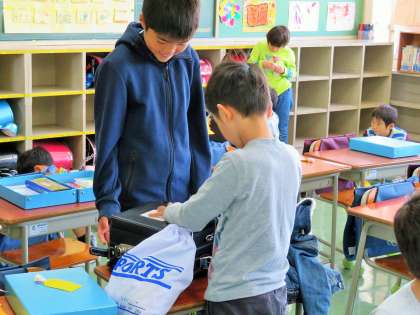 朝の支度を手伝っている姿から、見守っている姿が多くなりました。1年生は、やさしい6年生に見守られ、安心して1日のスタートをきっています。