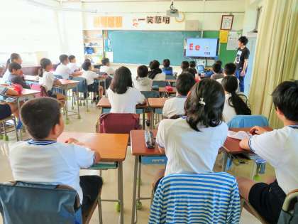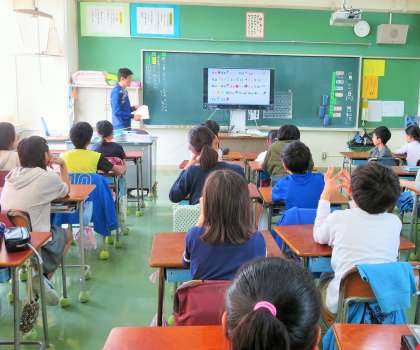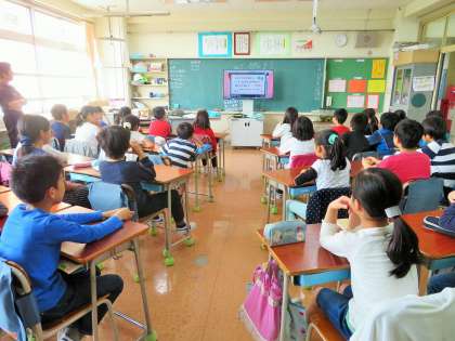5・6年生は、新学習指導要領を先行実施して、年間70時間の英語に取り組みます。今朝は15分間のモジュール授業で、映像を見ながら楽しそうにアルファベットを発音している姿が見られました。