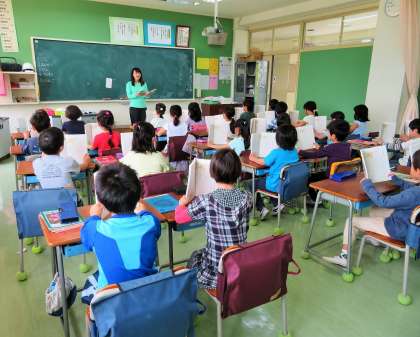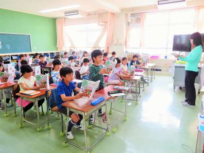 2年生の国語は「シーソーにのったら」の音読です。詩の風景の想像を楽しみ、語のまとまりや繰り返しなどに気をつけながら音読しました。一人一人が自分の番になるとさっと立ち、大きな声で元気よく声を出していました。真剣に取り組んでいる姿が素敵です。