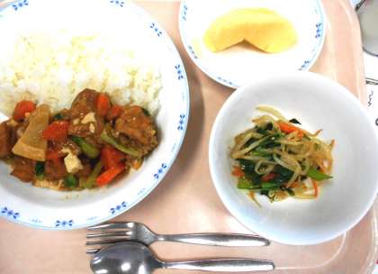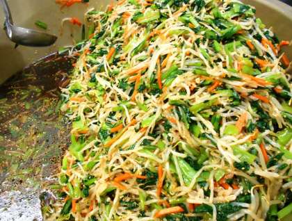 今日の副菜は、<ナムル>です。ナムルは、韓国でよく食べられている家庭料理です。給食によく登場します。砧っ子に人気のメニューです。